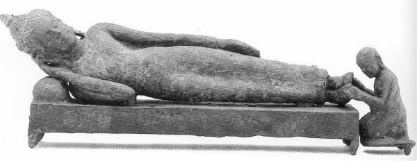 Op deze afbeelding zien we de Boeddha het parinirvana ingaan. Geheel in overeenstemming met het in de heilige teksten gegeven verslag zien we hoe de Boeddha op zijn rechterzij op een rustbank ligt, met de rechterhand het hoofd ondersteunend. Zijn oudste leerling Mahakasyapa, die op het moment van zijn intrede in het parinirvana afwezig was, kwam kort daarna terug en vereerde de voeten van zijn gestorven meester.