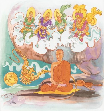 Sommige monniken kwamen naar hem toe om naar een geschikt meditatie onderwerp te vragen dat in overeenstemming was met hun karakter. De monniken groetten de Boeddha en gingen naar hun verblijfplaatsen waar zij de dag en de nacht door zouden brengen. Sommigen gingen naar het woud. Sommigen gingen naar de voet van bomen. Sommigen gingen naar een berg, en er waren er, die naar de deva-werelden gingen.