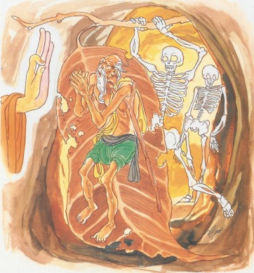 235. Je bent nu zoals een uitgedroogd blad, je bent in de macht van de dood; je staat nu op de drempel van de dood, nochtans heb je geen proviand voor onderweg. pandupalaso'va'dani'si yamapurisa'pi ca tam upatthita uyyogamukhe ca titthasi patheyyam'pi ca te na vijjati Nu ben je als een verdroogd, verkleurd blad. Het eerste zuchtje van de wind doet je vallen. De machten van de dood zijn voor je gekomen. Je staat nu op de drempel van de dood en je hebt geen enkel proviand voor onderweg. |