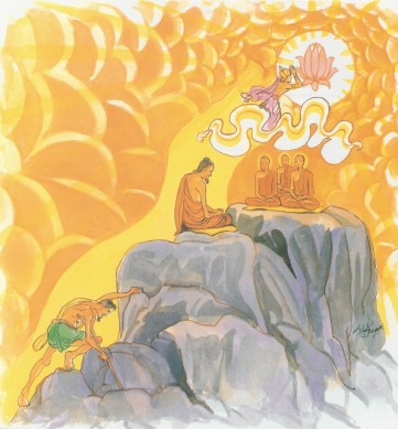 236. Maak van jezelf een eiland! Streef met grote vastberadenheid en wordt wijs! Bevrijd van onzuiverheden en hartstochtloos, zul je de hemelse sfeer van de Edelen binnengaan. so karohi dipam attano khippam vayama pandito bhava niddhantamalo anagano dibbam ariyabhumim ehisi Ben als een lamp, een eiland, een toevlucht voor jezelf. Streef vastberaden en ijverig en wordt een wijs mens. Bereik vrij van onzuiverheden en bezoedelingen, de hemelse wereld van de Edelen. |
