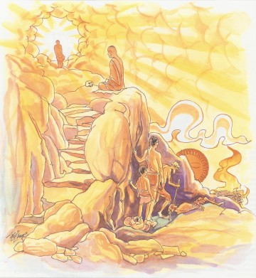 Zoals de zon, die zonder te stoppen tussen zonsopgang en zonsondergang beweegt, zo gaat ook het leven van wezens van deze wereld door, van geboorte naar dood. Niets in deze wereld is onsterfelijk. Het leven van een wezen is net zo vergankelijk als een dauwdrop aan het puntje van een grassprietje, vroeg in de morgenzon. Het verdwijnt net zoals een lijn die op het water getrokken wordt of zoals een luchtbel aan de oppervlakte van het water. Het leven komt tot een einde gedurende een van de volgende fases: tijdens de kinderjaren, tijdens de jeugd of bij ouderdom.