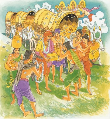 Op de vooravond van zijn terugreis, zette Citta alle spullen die hij had meegenomen in de kamers van het klooster als offergave aan de Boeddha. En toen vulden de deva's de lege wagens met verschillende dingen van onschatbare waarde. Toen de Eerwaarde Ananda zag, hoe Citta's rijkdommen bijgevuld werden, vroeg hij de Boeddha: "Eerwaarde Heer! Is het enkel en alleen dat Citta u benaderd heeft, dat hij gezegend is met al deze rijkdommen? Is hij eveneens zo gezegend wanneer hij ergens anders heengaat?"