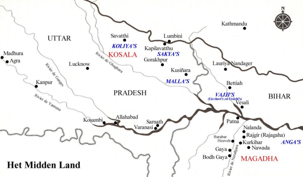 In het noordwesten lag Magadha's hoofdrivaal Kosala met Savatthi als hoofdstad, en ten tijde van de Boeddha vlogen deze twee landen elkaar vaak in de haren. Kosala regeerde over het eigen vaderland van de Boeddha, de Sakya republiek. De laatste 20 jaren van zijn leven bracht de Boeddha meestal door in Kosala. Koning Pasenadi was een van zijn meest toegewijde lekendiscipelen.