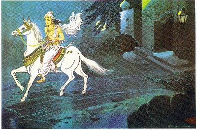 Op de dag van de volle maan in de maand juli (asalha) ontving de kroonprins het bericht dat zijn mooie vrouw Yasodhara was bevallen van een zoon. Verontrust door deze nieuwe ontwikkeling, door deze nieuwe band die hem nog steviger aan de wereld zou binden, besloot de prins nog dezelfde nacht het paleis te verlaten. Op dat moment is hij 29 jaar. Alles wat hij had gaf hij uit mededogen voor de ganse wereld op. Zelfs zijn vrouw en enige kind die hem zeer geliefd waren, liet hij achter -- een hartverscheurend afscheid dat hem diep raakte. Dit staat bekend als de grote verzaking. Maar hij beloofde in zijn hart terug te keren wanneer hij zijn zoektocht volbracht had en het medicijn tegen het lijden gevonden had. Zijn zoektocht eindigde 6 jaren later onder de Bodhi boom, de 'Boom der Verlichting' te Uruvela (nu Bodh Gaya).