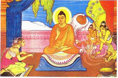 Omdat Khema, de wederhelft van koning Bimbisara, wist dat de Boeddha dit onderwees, probeerde ze steeds wanneer ze de tempel bezocht, een ontmoeting met de Boeddha te voorkomen. Omdat zij buitengewoon mooi was, was ze bang dat de Boeddha zijn minachting over haar zelfbewustzijn omtrent haar zelfingenomenheid zou uitspreken. Hij zou wel eens over de vergankelijke aard van dingen kunnen spreken. Maar op een zekere dag liet de koning haar toch bij de Boeddha brengen. De Boeddha creëerde met zijn bovenwereldse gave vlak voor Khema een luchtspiegeling van een mooie vrouw. Hij liet de figuur gestaag ouder worden. Telkens wanneer Khema met haar oogleden knipperde, werd de vrouw een tiental jaren ouder: eerst was ze van middelbare leeftijd, toen van hoge leeftijd en vervolgens iemand van zeer oude leeftijd die van geen enkel nut meer kon zijn.