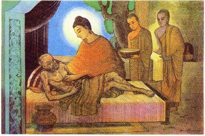 Ondanks het feit dat ten tijde van de Boeddha de studie en praktijk in medicinale en chirurgische wetenschap tot op grote hoogte was ontwikkeld, werd er nauwelijks aandacht besteed aan het verplegen van en het omzien naar de zieken. Putigatta Thera Tissa was een monnik die getroffen was door een huidziekte die zijn gehele lichaam bedekte met zweren. Toen zijn medemonniken hem links lieten liggen, verergerde zijn toestand. De Boeddha ging naar de zieke monnik die er nu doodziek bij lag, baadde hem met behulp van Ananda Thera en verschoonde zijn onder- en bovengewaad. Nadat de Boeddha het hem wat aangenamer had gemaakt, predikte hij zijn Leer tot hem door hem de ware aard van het menselijk lichaam uit te leggen. Verlicht door de toespraak werd de ouderling (Thera) een arahat. Vervolgens sprak de Boeddha de andere monniken aan over de edele taak om voor de zieken te zorgen. Vanwege het mededogend aansporen van de Meester en het opvolgen van zijn edele voorbeeld, begonnen lekenvolgelingen ziekenafdelingen in alle grote kloosters te bouwen. Later liet koning Dhammasoka niet alleen ziekenhuizen voor mensen bouwen, maar ook voor dieren. En zo is de eerste oprichting van ziekenhuizen (in elk geval voor dieren) toe te schrijven aan boeddhisten. Een boeddhist beschouwd elk voelend wezen als een wezen dat het recht heeft op goede verzorging en geluk.